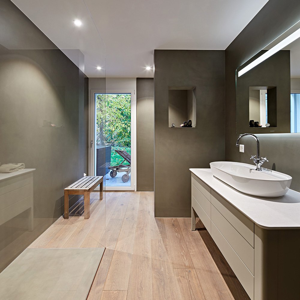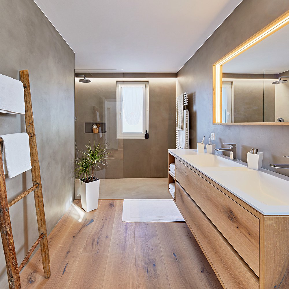 Eine Fläche aus Sichtbeton kann einem Interieur einen urbanen Industrie-Look verleihen. Dank unserer speziellen Spachteltechnik brauchts dafür keinen echten Beton.